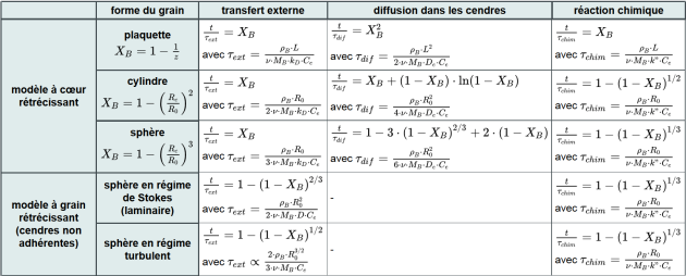 Le tableau ci-dessous synthétise les expressions des temps caractéristiques et des temps de conversion correspondants à chaque régime pour différentes formes de particules et pour les modèles à cœur rétrécissant (constant size particles) et à grain rétrécissant (shrinking sphere) :