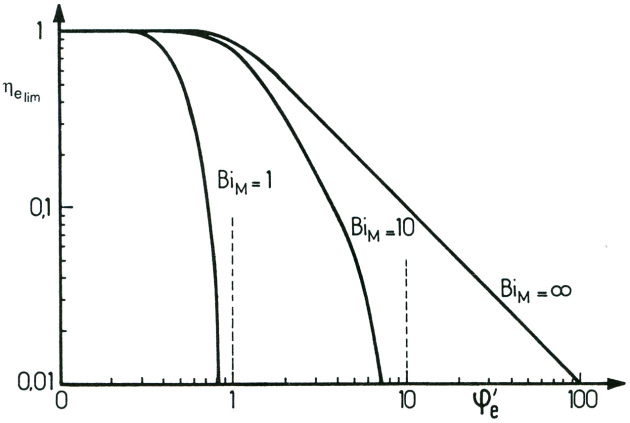 Pour des nombres de BIOT matière de plus en plus faibles, le facteur d'efficacité chute de plus en plus rapidement avec le critère modifié de THIELE en régime diffusionnel ; alors que le régime chimique n'est pas affecté.