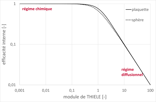 La forme de la courbe dans la zone de régime intermédiaire (où il n'y a prédominance ni de la cinétique chimique ni du transfert par diffusion) dépend de la forme des grains de catalyseurs. Ainsi pour des grains sphériques, la solution de l'équation différentielle du bilan matière fournit : \(\eta_s = \frac{3 \cdot \varphi_s \cdot \mathrm{coth \:} (3 \cdot \varphi_s ) - 1}{3 \cdot {\varphi_s}^2}\) et la courbe se trouve un peu en dessous de celle représentée ci-dessus. En revanche les asymptotes en régimes chimique et diffusionnel sont inchangées.