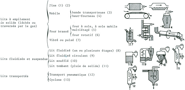 L'illustration suivante présente les différents types de réacteurs à solide consommable (essentiellement des réacteurs gaz/solide, mais certains peuvent aussi être utilisés avec une phase liquide).